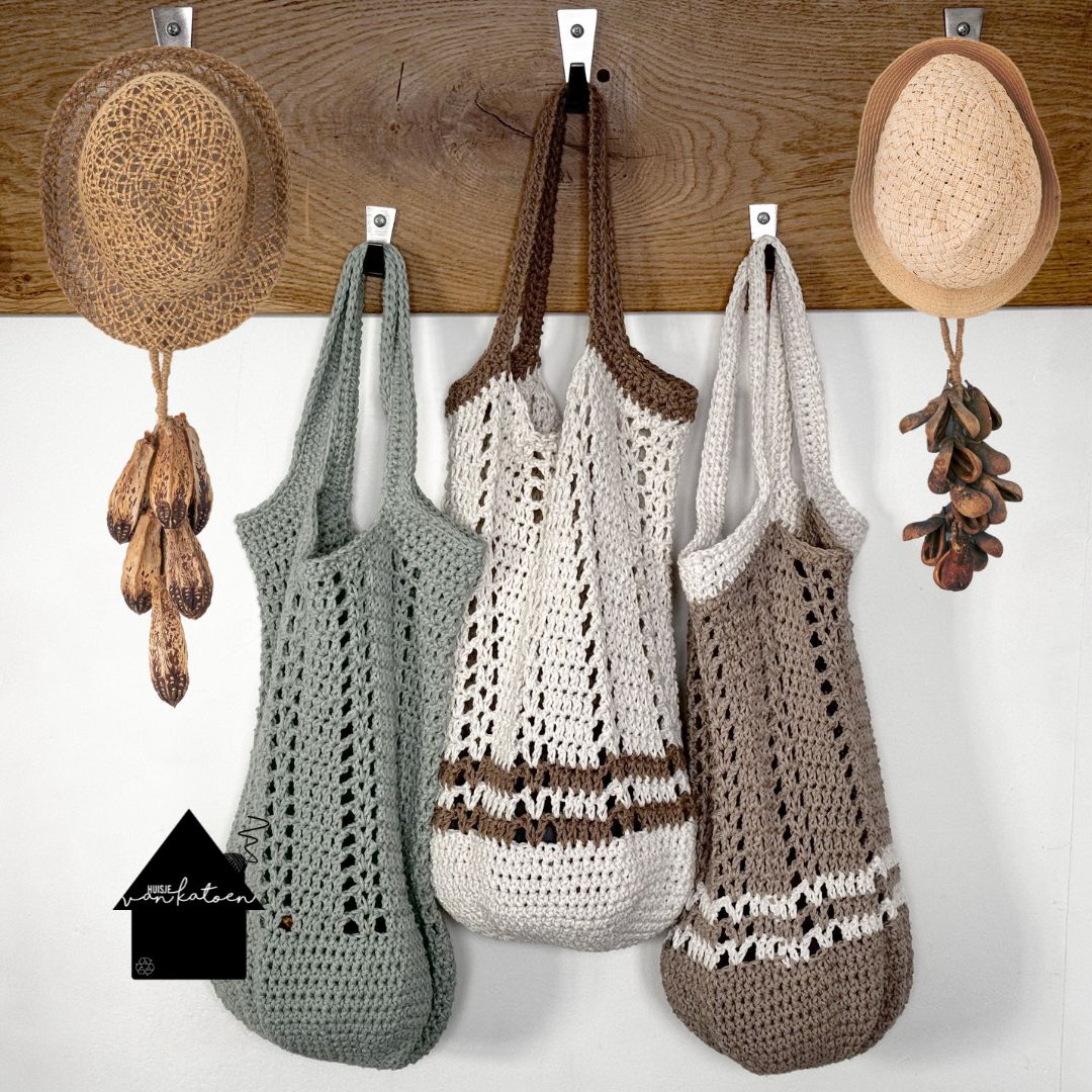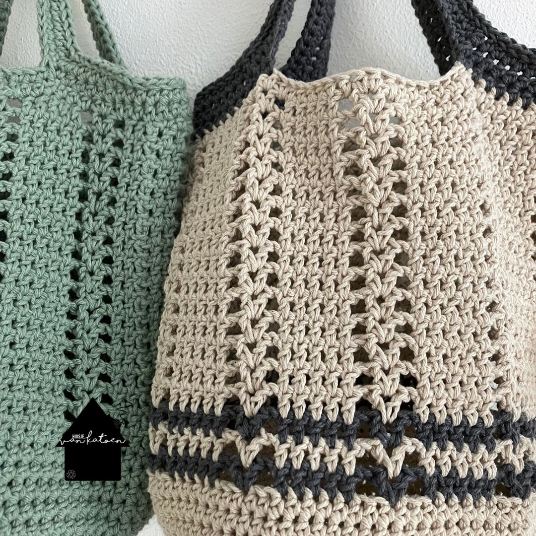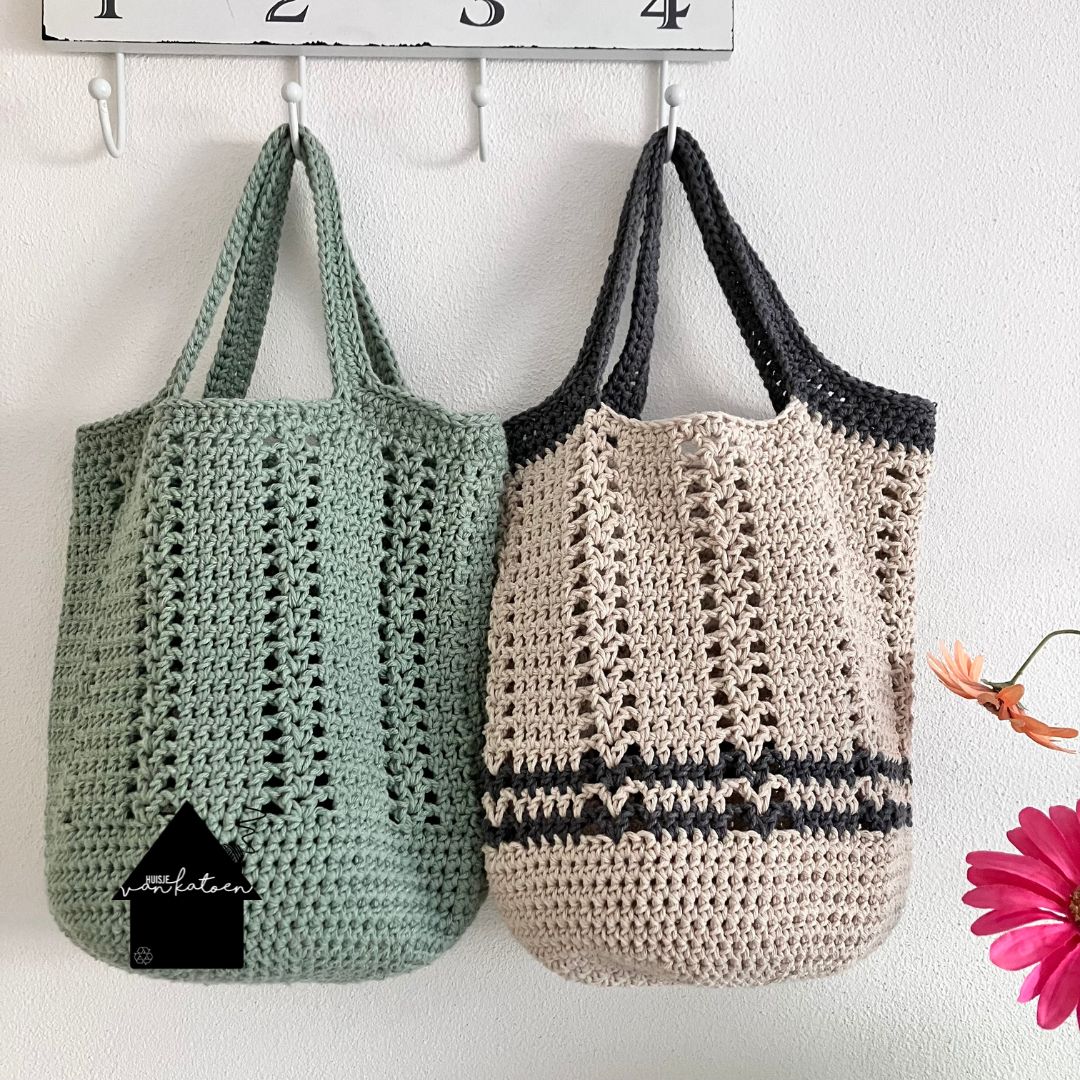 De tas heeft een mooi ajour patroon, maar de bodem is helemaal dicht, zodat je spulletjes er natuurlijk niet uit kunnen vallen. Er zijn 2 varianten, effen en met een accentkleurtje.