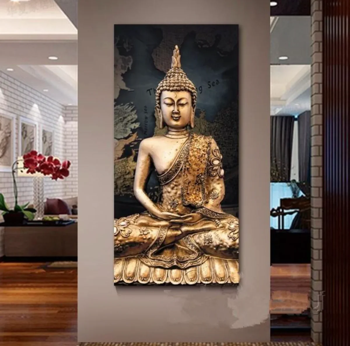 Straal innerlijke vrede en kracht uit met deze indrukwekkende diamond painting van een gouden Boeddhabeeld 🪷. De gedetailleerde versieringen en warme goudtinten ✨ geven het geheel een luxe en serene uitstraling, perfect tegen de wereldkaart op de achtergrond 🌍.