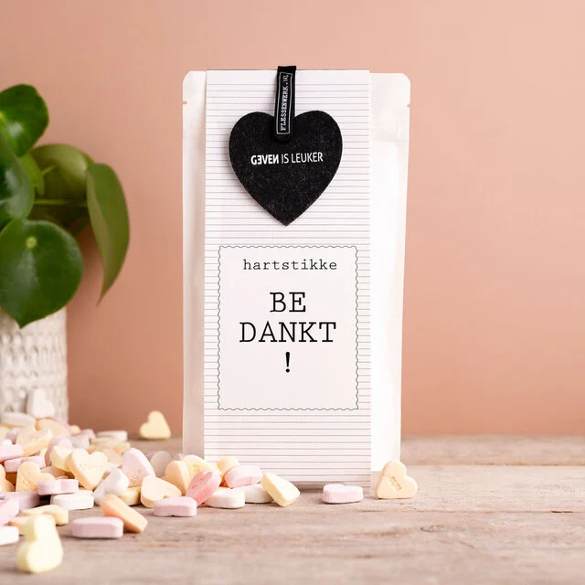 Een leuke hersluitbare zak met hartjes snoep erin. De zak is wit met een leuk golven patroon. Op de snoepzak staat de tekst ‘Hartstikke bedankt!’. Als extra kado zit er een vilten hart aan het zakje. Lief om te geven en te krijgen.