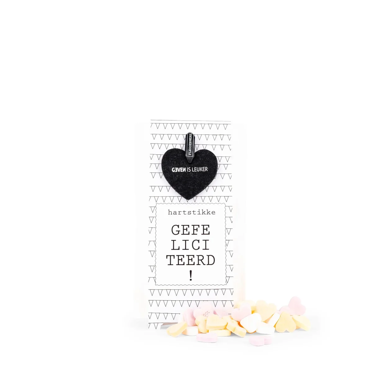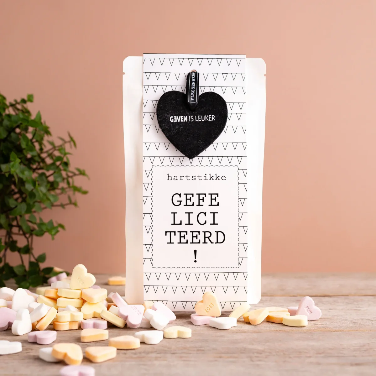 Een leuke hersluitbare zak met hartjes snoep erin. De zak is wit met een leuk golven patroon. Op de snoepzak staat de tekst ‘Hartstikke gefeliciteerd!’. Als extra kado zit er een vilten hart aan het zakje. Lief om te geven en te krijgen.