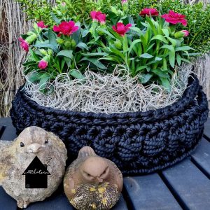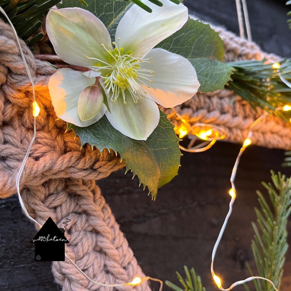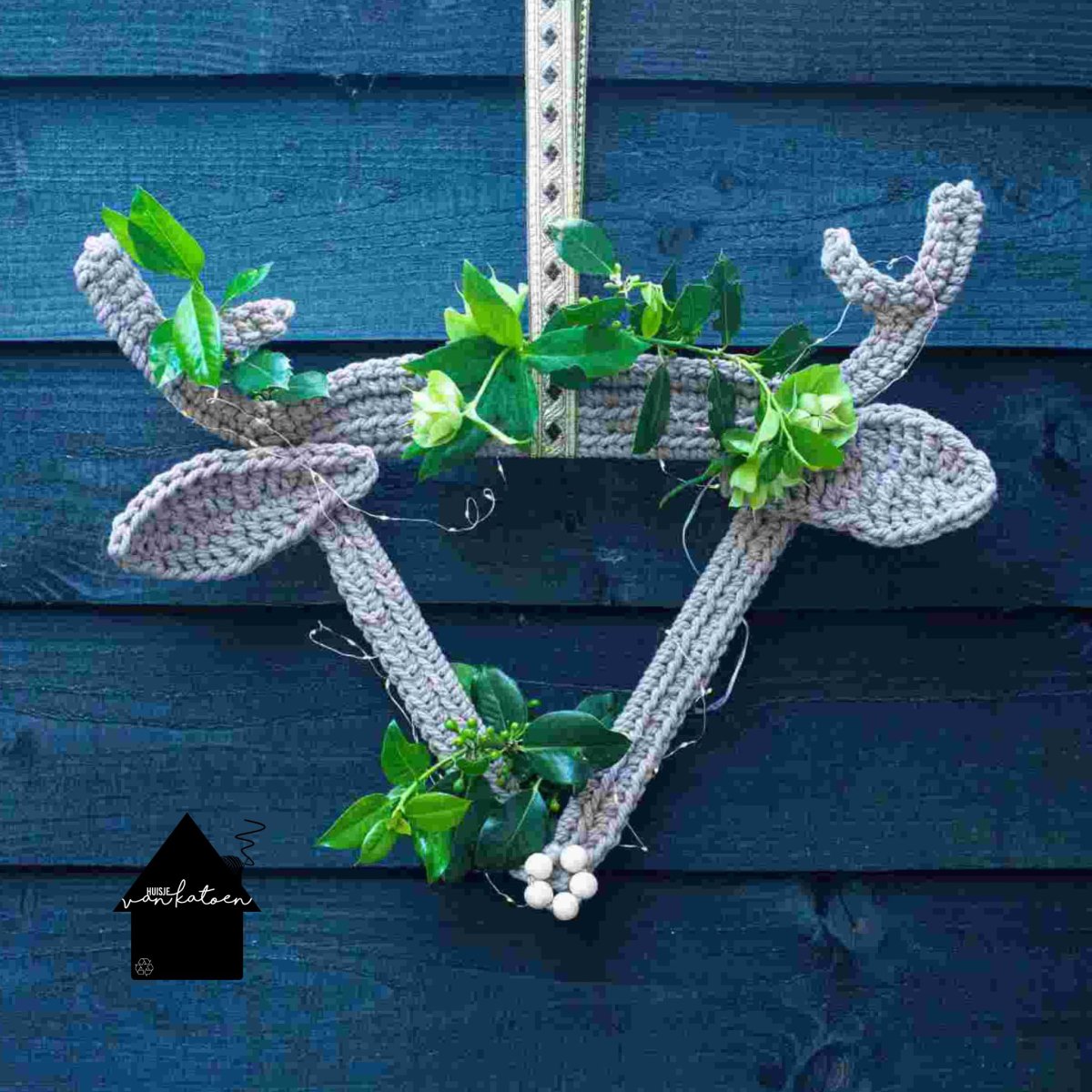 Om deze prachtige hertenkop te maken werk je met gerecycled polyester koord. Dit garen is speciaal ontwikkeld voor buiten en blijft echt jarenlang mooi. Na het haken versier je Helleborus met verse groene takken en lampjes. Zoek een plekje op je schutting, balkonmuur, buitenmuur of voordeur en geniet tijdens de herfst en winter van een duurzame wandversiering.