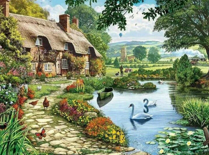 ✨🏡 Dit betoverende tafereel straalt pure rust en geluk uit. Een knus Engels huisje met een rieten dak wordt omringd door weelderige bloemen 🌸🌼 en een kronkelend paadje waar kippen rustig rond scharrelen 🐓. Het kabbelende water weerspiegelt de sereniteit van de natuur, waar twee elegante zwanen gracieus overheen glijden 🦢💧. In de verte zie je groene heuvels, een oude kerk ⛪, en een luchtballon die zachtjes door de hemel zweeft 🎈—een vleugje avontuur in een oase van kalmte.