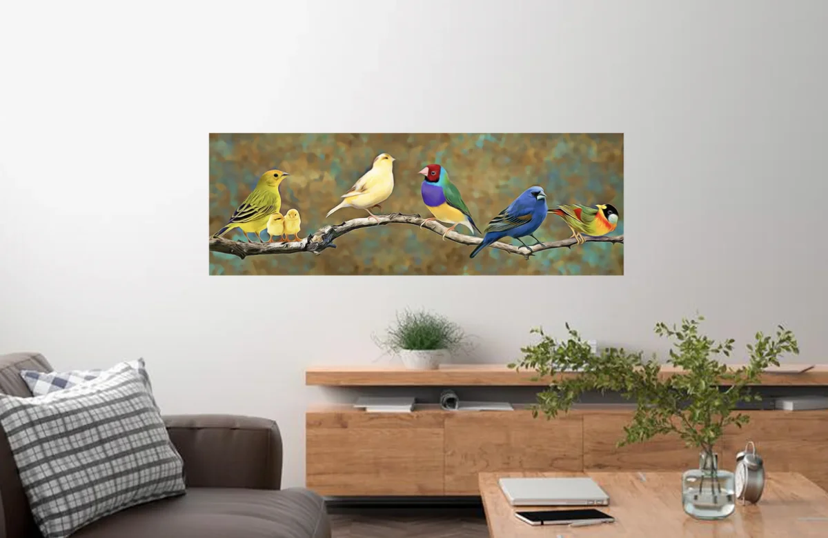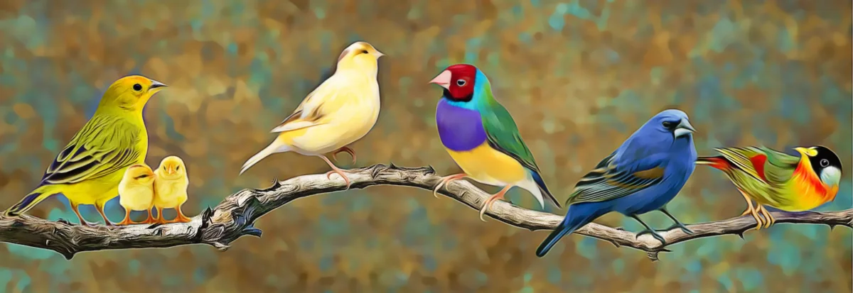 Een kleurrijke verzameling zangvogels zit vrolijk op een sierlijke tak, elk met hun eigen unieke verenpracht en charme 🐥🌈. Van een gele kanarie met haar schattige kuikentjes tot een levendige roodkopgoudvink, een blauw zangvogeltje en een bontgekleurde gouldamadine — deze afbeelding barst van leven en harmonie. De warme, schilderachtige achtergrond maakt het tafereel rustgevend en perfect voor een kleurrijke diamond painting vol natuurpracht 🌿🪺.