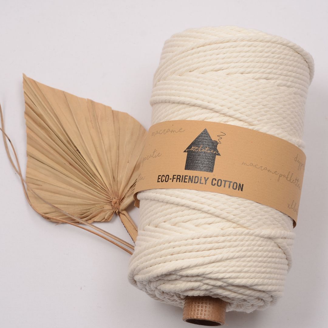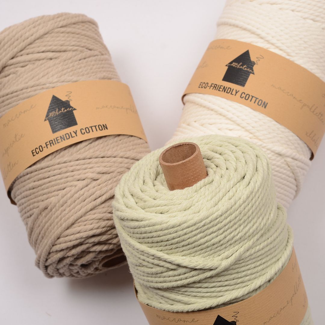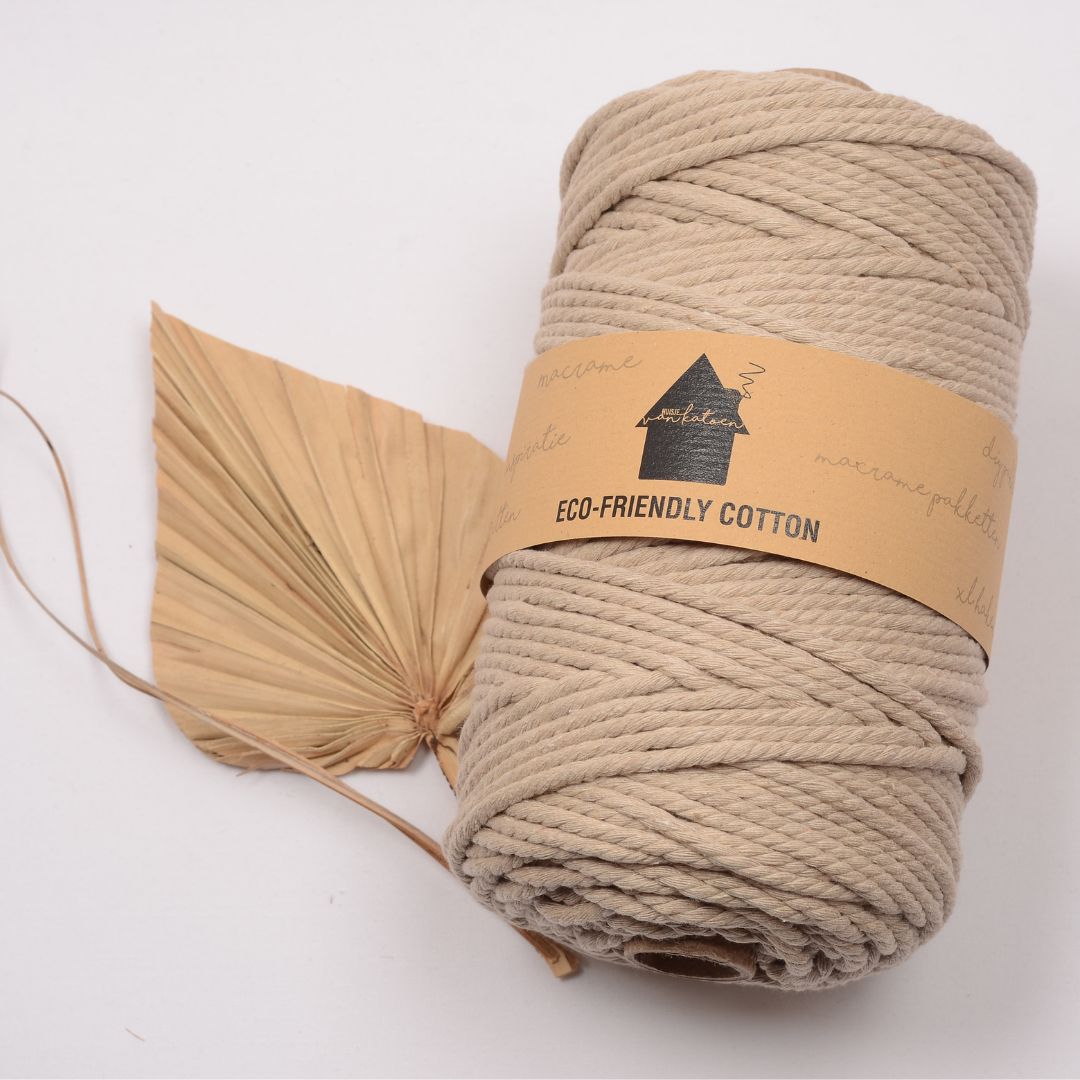 Kieppari 5mm 3 strengs 150 mtr is een gerecycled macramé koord met een dikte van circa 5 mm, opgebouwd uit 3 strengen. Het garen bestaat voor 80% uit katoen en 20% polyester. Het polyester is dit garen is gerecycled van petflessen.