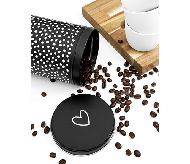 Een echte koffieliefhebber? Dan mag dit koffieblik bij jou in de kast niet ontbreken. En hij is zo leuk, dat hij eigenlijk niet in de kast hoort, maar verdient een mooie plekje bij jou koffiehoekje op tafel of het aanrecht. Het koffieblik heeft een mooie mat zwarte uitstraling en heeft aan de zijkant een stippen patroon. Bovenop de trommel staat een hartje. Cadeautip: vul het koffieblik met koffiebonen, koffiepads of cups en geef het cadeau!