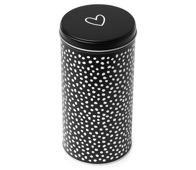 Koffieblik Hart, zwart wit stippen, Zoedt