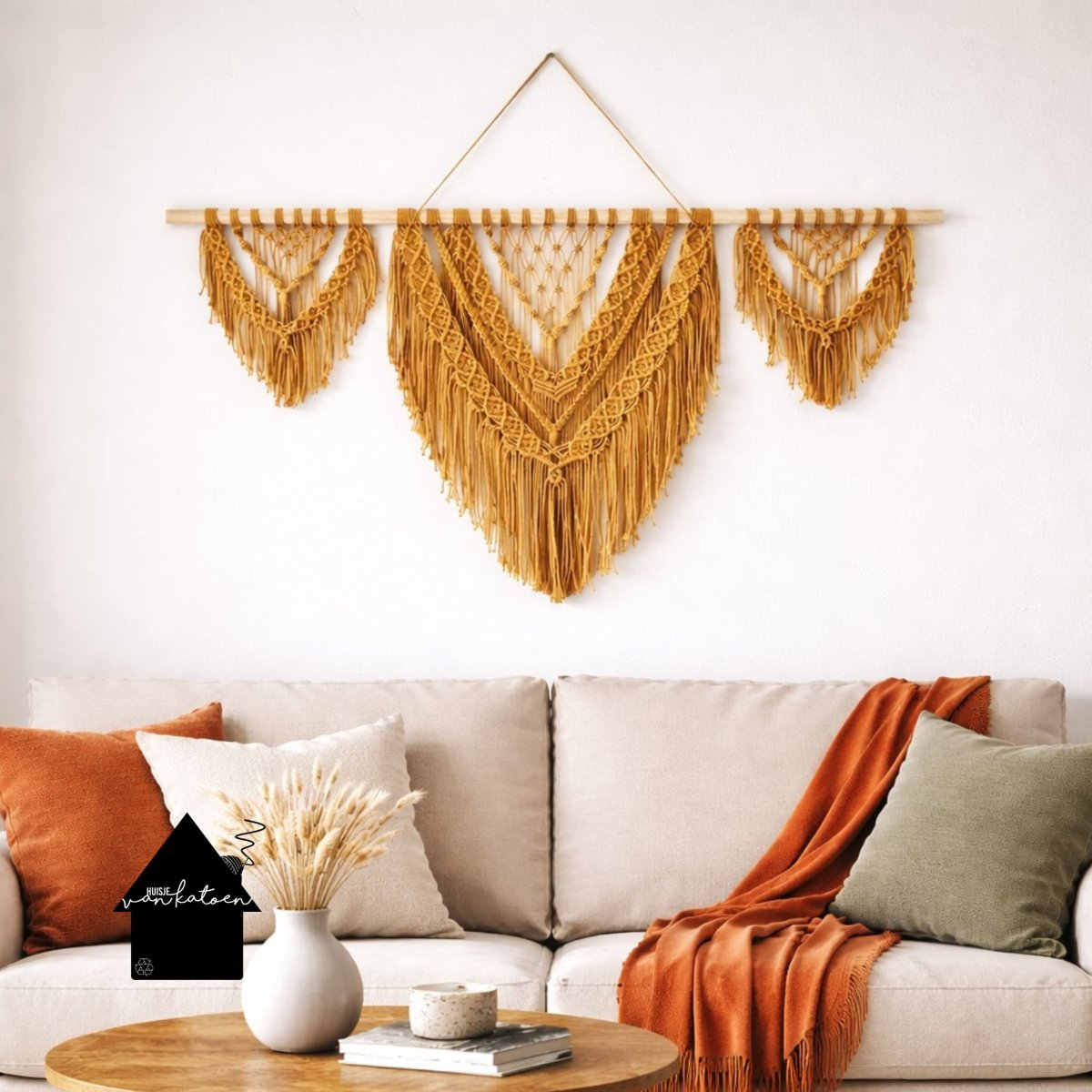 Afmeting: de stok is 120 cm en het middelste wandkleed is ca 70 cm hoog