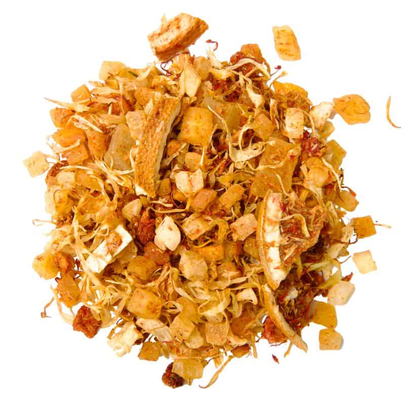Ingrediënten: Gekonfijte ananasstukjes (ananas, suiker, zuurbuffer: citroenzuur), gekonfijte mangostukjes (mango, suiker, zuurteregelaar: citroenzuur) (31%), sinaasappelschijfjes, aroma, mango-fruitgranulaat (glucosestroop, mangopulpconcentraat, verdikkingsmiddel: natriumalginaat) (3%), aardbeienstukjes, goudsbloem, kleurstofdistel, vitaminenmengsel (ascorbinezuur, nicotinamide, vitamine E, pantotheenzuur, vitamine B6, vitamine B2, vitamine B1, foliumzuur, biotine, vitamine B12, dragermateriaal: gedroogde glucosestroop), natuurlijk sinaasappelaroma, natuurlijk aroma.