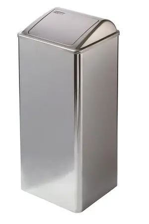 Afvalbak met push klep. Staat op 4 kunststof voetjes. Deksel is in zijn geheel van de onderbak af te nemen. Met 4 haken aan de binnenzijde voor ophanging van de afvalzakken.