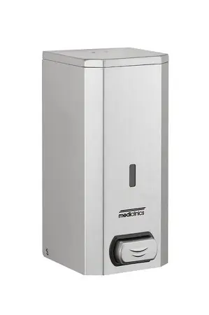 Foamzeepdispenser voor wandmontage. Met RVS drukknop voor het doseren van de vulgoederen. Met veerslot en Mediclinics sleutel. Met kijkgleuf voor inhoudscontrole. Met verwijderbare navulfles. Ook eenvoudig vanaf bovenaf na te vullen. Modulair systeem.