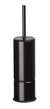 Toiletborstelhouder vrijstaand of voor wandmontage. Rond model. Met verwijderbare zwarte opvangschaal aan de onderzijde. Met zwarte deksel vast aan de steel, die de houder compleet afsluit. Met witte borstelkop.