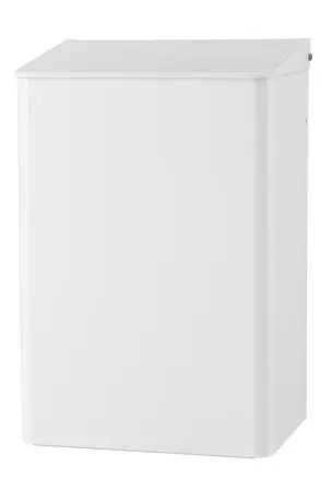 Afvalbak met klepdeksel. Met binnenring en RVS wandplaat. De bak is afneembaar van de wandplaat. Met 4puntsbevestiging.
