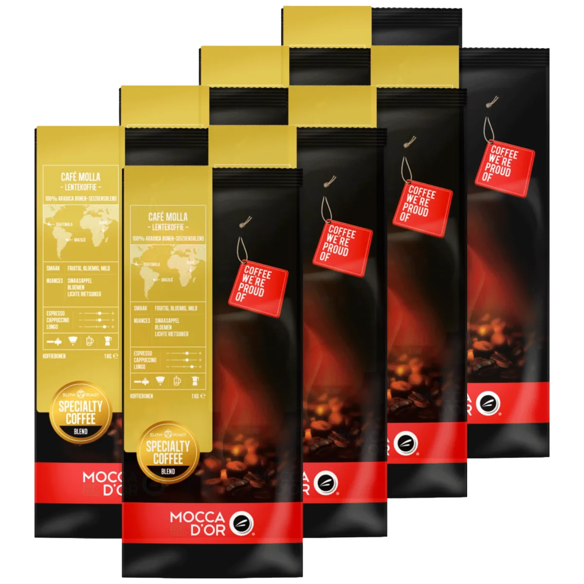 De Mocca d’Or Café Molla is al jaren de speciale lentekoffie en dus alleen gedurende dit jaargetijde verkrijgbaar. Deze koffie is een blend van Zuid-Amerikaanse en Afrikaanse koffiesoorten. Verschillende smaaksensaties als fruitig en bloemig komen terug in deze koffie. Nuances van sinaasappel, bloemen en lichte rietsuiker maken deze koffie bijzonder lekker! De Café Molla is geschikt voor alle koffievarianten, maar bijzonder lekker als lungo. Met dit voordeel pakket bespaart u veel geld wanneer u al van plan was om groots in te slaan.