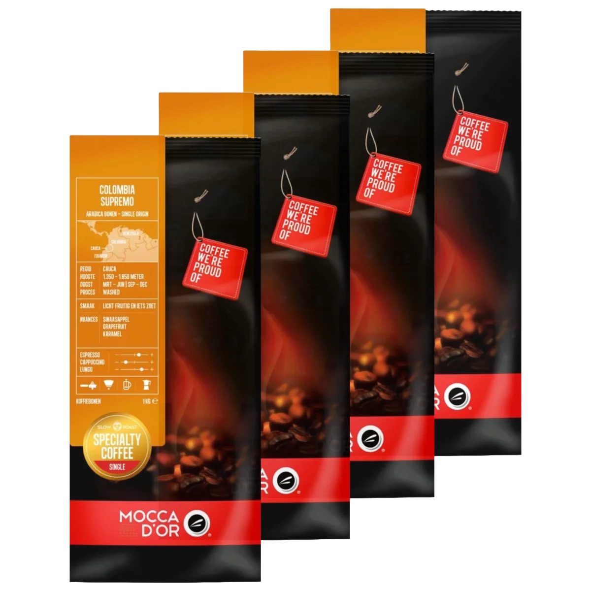 De Mocca d’Or Colombia Supremo 4kg is een Single Origin koffie en een echte klassieker! Bestaande uit 100 % Arabica bonen met een licht fruitige en iets zoete smaak. Deze koffie heeft smaaknuances van sinaasappel, grapefruit en karamel. De naam Supremo verwijst naar het formaat van de koffieboon; deze is groot. De boon komt uit het Cauca gebied in het Zuid-Amerikaanse Colombia. De Colombia Supremo is geschikt voor alle koffievarianten, maar komt bijzonder goed tot zijn recht als een espresso of een lungo.