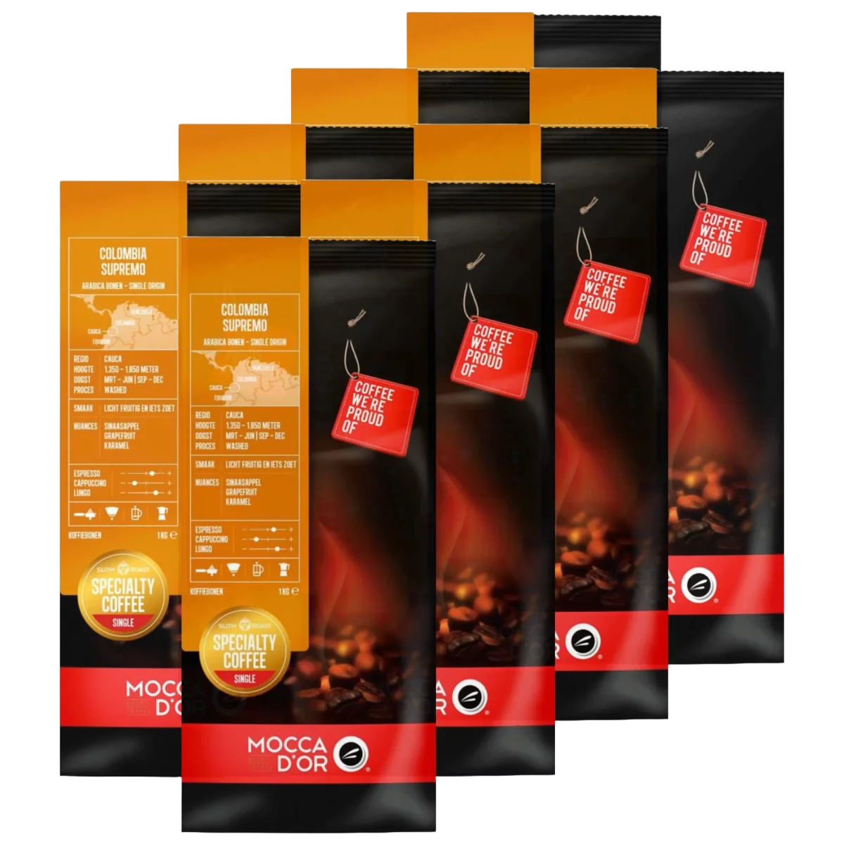 De Mocca d’Or Colombia Supremo 8kg is een Single Origin koffie en een echte klassieker! Bestaande uit 100 % Arabica bonen met een licht fruitige en iets zoete smaak. Deze koffie heeft smaaknuances van sinaasappel, grapefruit en karamel. De naam Supremo verwijst naar het formaat van de koffieboon; deze is groot. De boon komt uit het Cauca gebied in het Zuid-Amerikaanse Colombia. De Colombia Supremo is geschikt voor alle koffievarianten, maar komt bijzonder goed tot zijn recht als een espresso of een lungo.