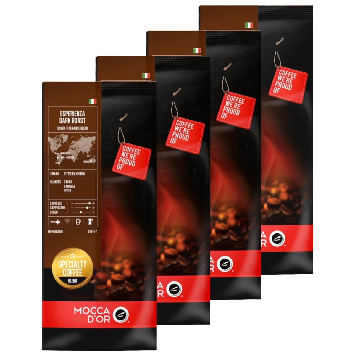 Mocca d’Or Esperienza Dark Roast 4KG is een van onze vier Italiaanse blends. Samengesteld uit arabica en robusta bonen afkomstig uit Zuid-Amerika en Indonesië.