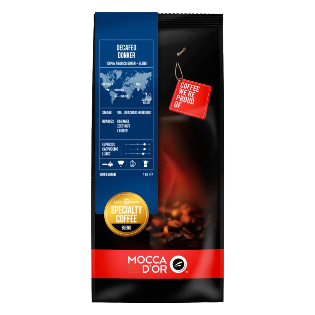 Uiteraard bieden wij ook gedecafeïneerde koffiesoorten. De Mocca d’Or Espresso Decafeo Donker is een uitgekiende blend van 100% Arabica bonen afkomstig uit onder andere Brazilië, Guatemala, Honduras en India. De smaak is vol, rijk en iets zoet met verfijnde nuances van mandarijn en karamel.