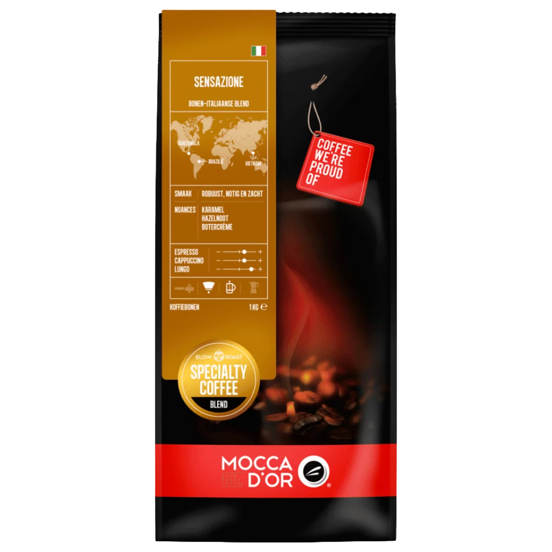 De Mocca d’Or Espresso Sensazione is een van onze vier Italiaanse blends; afkomstig uit Guatemala, Brazilië en Vietnam. De smaak is robuust, notig en zacht met nuances van karamel, hazelnoot en botercrème. Deze koffie is voor iedere fijnproever een genot. De Mocca d’Or Espresso Sensazione is geschikt voor alle koffievarianten, maar voornamelijk heerlijk als filter of met een cafétière gezet.