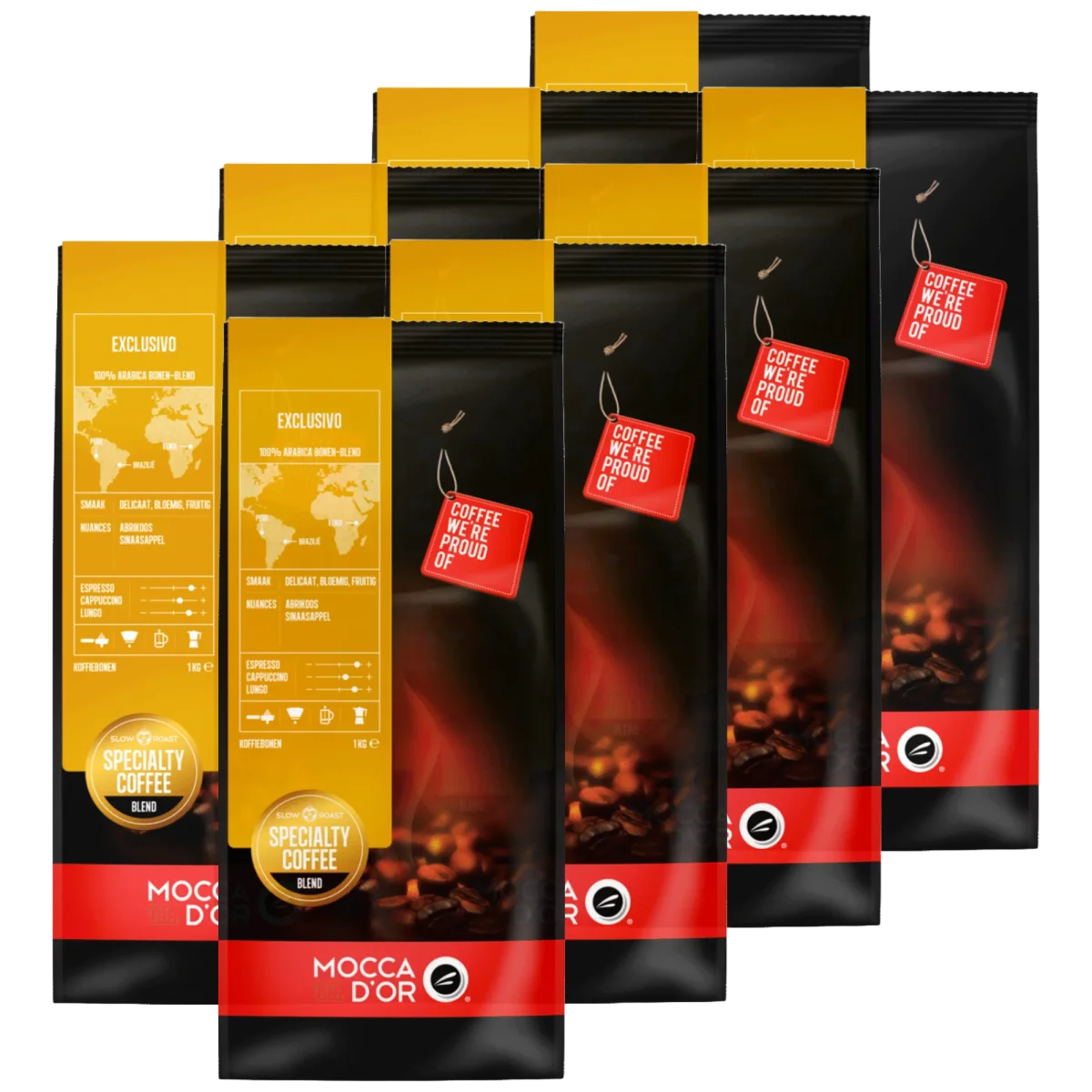 De Mocca d’Or Exclusivo 8kg is een prachtige uitgebalanceerde espressomelange van 100% Arabica bonen uit Zuid-Amerika en Afrika. Hou jij van een volle smaak met een mooie mix van rins en zoet? Dan moet je deze koffie zeker eens proberen. De Exclusivo heeft een delicate, bloemige en fruitige smaak met duidelijke nuacances van abrikoos en sinaasappel.