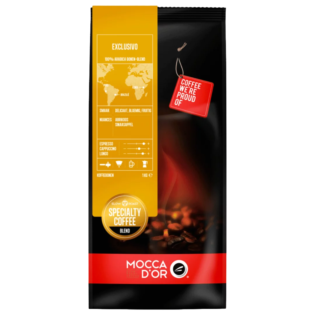 De Mocca d’Or Exclusivo is een prachtige uitgebalanceerde espressomelange van 100% Arabica bonen uit Zuid-Amerika en Afrika. Hou jij van een volle smaak met een mooie mix van rins en zoet? Dan moet je deze koffie zeker eens proberen. De Exclusivo heeft een delicate, bloemige en fruitige smaak met duidelijke nuacances van abrikoos en sinaasappel.