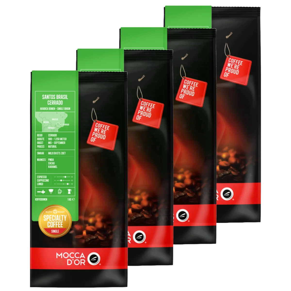 De Mocca d’Or Santos Brasil Cerrado 8kg is een Single Origin koffie bestaande uit 100% Arabica bonen. Een milde, zachte koffie met een iets zoete smaak. Deze koffie biedt smaaknuances van pinda, cacao en karamel.