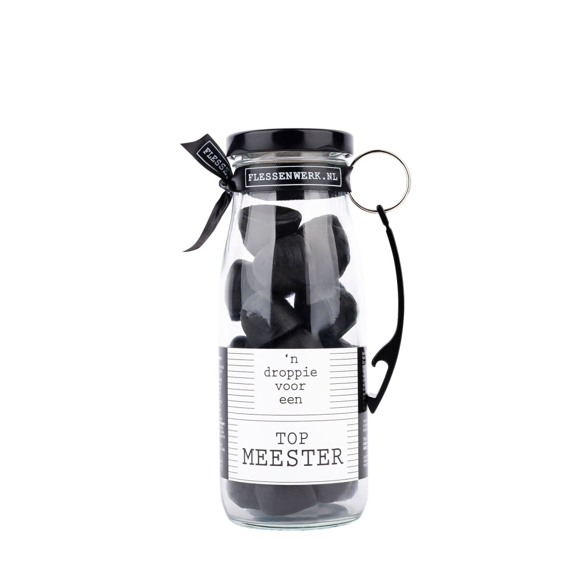 Leuk flesje gevuld met heerlijke drop. Op de fles staat de tekst ’n Droppie voor een topmeester’ en aan het flesje zit een handige flessenopener. Een lekker origineel en tegelijkertijd grappig kado om aan de meester te geven.