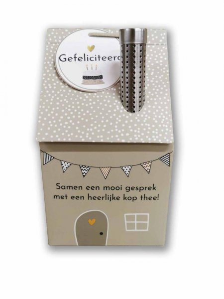 Op zoek naar een origineel cadeau? Dit Thee Huisje cadeau verwent de ontvanger met 50 gram heerlijke thee, een doosje gesprekskaartjes en een thee-infuser in de vorm van een schoorsteen. Zo kun je samen een gezellig gesprek voeren over van alles, het leven, of gewoon over jarig zijn, terwijl je geniet van een heerlijke kop thee!
