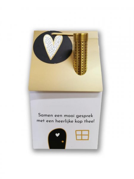 Op zoek naar een origineel cadeau? Dit Thee Huisje cadeau verwent de ontvanger met 50 gram heerlijke thee, een doosje gesprekskaartjes en een thee-infuser in de vorm van een schoorsteen. Zo kun je samen een gezellig gesprek voeren over van alles, het leven, of gewoon over jarig zijn, terwijl je geniet van een heerlijke kop thee!