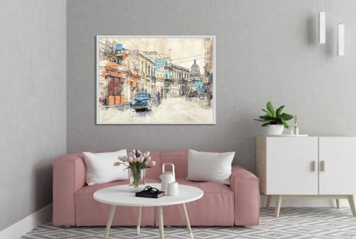 Deze sfeervolle afbeelding toont een kleurrijke straat in het hart van Havana, Cuba, met klassieke koloniale gebouwen, verweerde gevels en een iconische oldtimer die het beeld compleet maakt. In de verte prijkt het majestueuze Capitool, wat de scène een extra vleugje geschiedenis en grandeur geeft. 🏛️🚙🌆