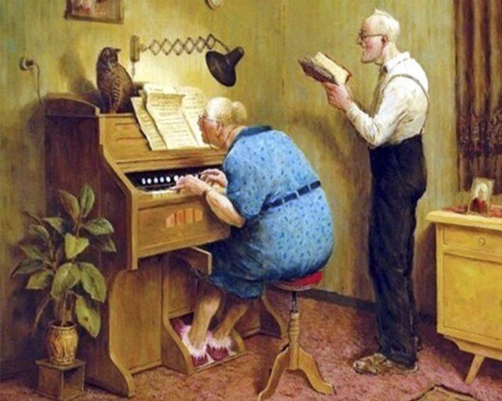 Deze charmante diamond painting vangt een liefdevol en nostalgisch moment tussen een ouder echtpaar in hun knusse huiskamer 🛋️💕. De vrouw speelt met toewijding op het orgel 🎹, terwijl haar man, met bril op de neus, mee leest of zingt uit een boek 📘. Hun houding, kleding en omgeving ademen rust, eenvoud en de schoonheid van samen oud worden. Elk glinsterend steentje brengt dit warme tafereel tot leven — een eerbetoon aan muziek, liefde en het dagelijks geluk van vroeger ✨🕯️