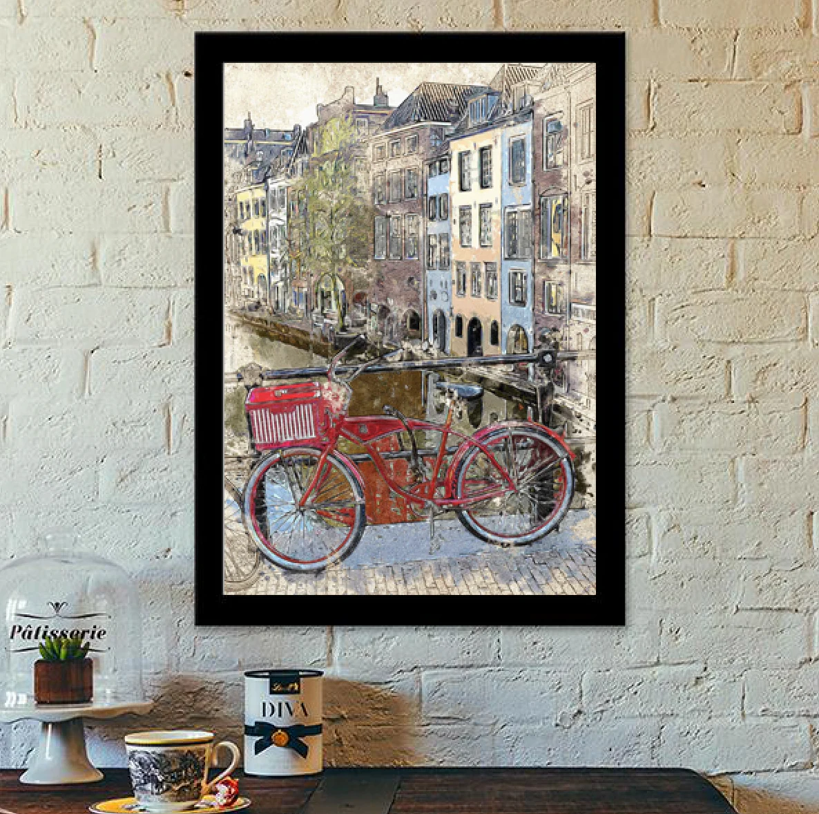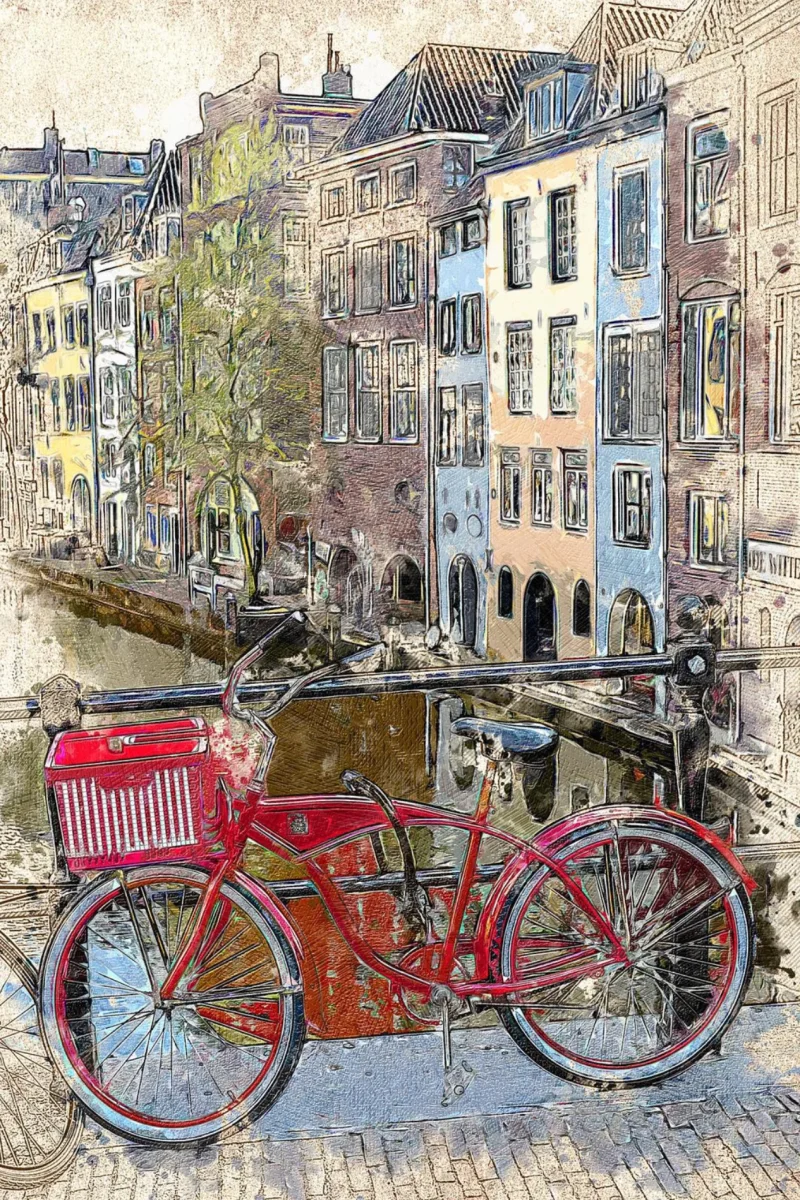 Een iconisch beeld van het hart van Utrecht: de schilderachtige Oudegracht met haar historische grachtenpanden en levendige charme 🏘️🌊. Op de voorgrond staat een klassieke rode fiets met een mandje, symbool van het Nederlandse straatbeeld 🚴🇳🇱. De rustige gracht weerspiegelt de oude gevels en ademt een nostalgische sfeer uit, alsof de tijd even stil staat 🕰️🍂. Dit kunstzinnige tafereel vangt de ziel van de stad – warm, vertrouwd en vol karakter ❤️🏙️.