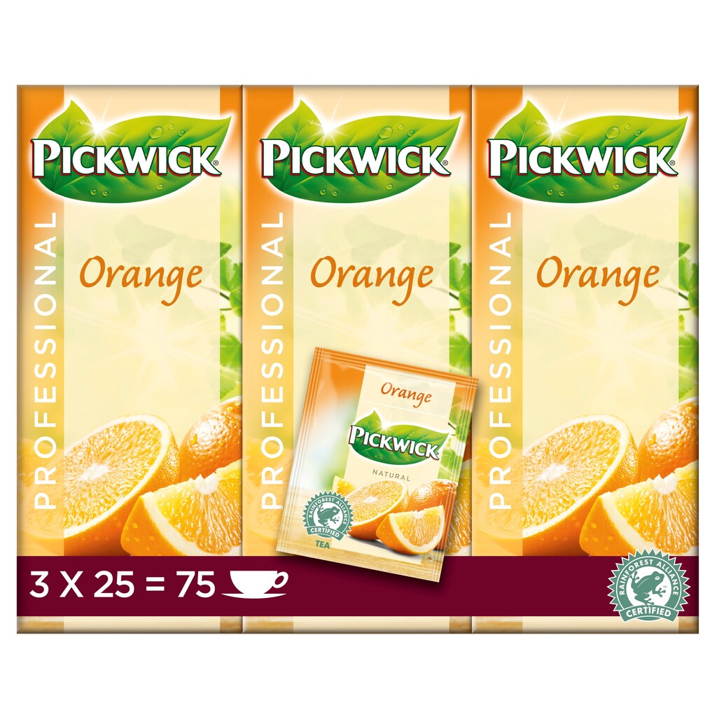 Pickwick Sinaasappel is een zwarte thee met sinaasappel; de Fruitthee varianten zijn 100% natuurlijke theemelanges op basis van zwarte thee en echte stukjes fruit. Verpakt in een volledig gesloten papieren envelop die bij het oud papier kan. Dit product is Fairtrade gecertificeerd.