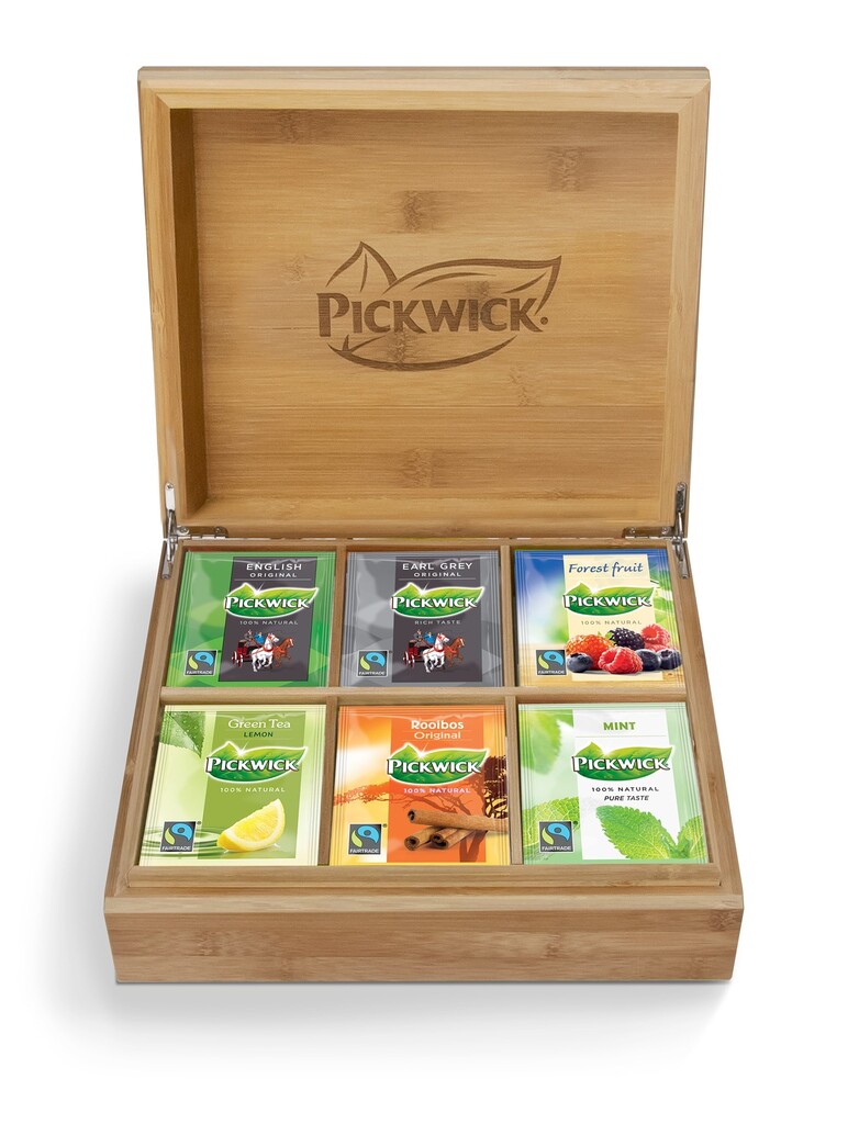 De 6-vaks bamboe theekist is gevuld met de zes Fairtrade smaken Pickwick Earl Grey, Engels, Groene thee Original Lemon, Rooibos, Bosvruchten en Munt. Verpakt in een volledig gesloten papieren envelop die bij het oud papier kan.