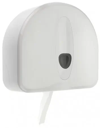 Jumboroldispenser mini + restrol voor wandmontage. Met kartelrand aan de onderzijde voor optimale afscheuring van de rol. Met automatische rolverwisseling. Met slot en sleutel. Standaard met grijs venster. Geschikt voor logobedrukking. Universeel navulbaar.