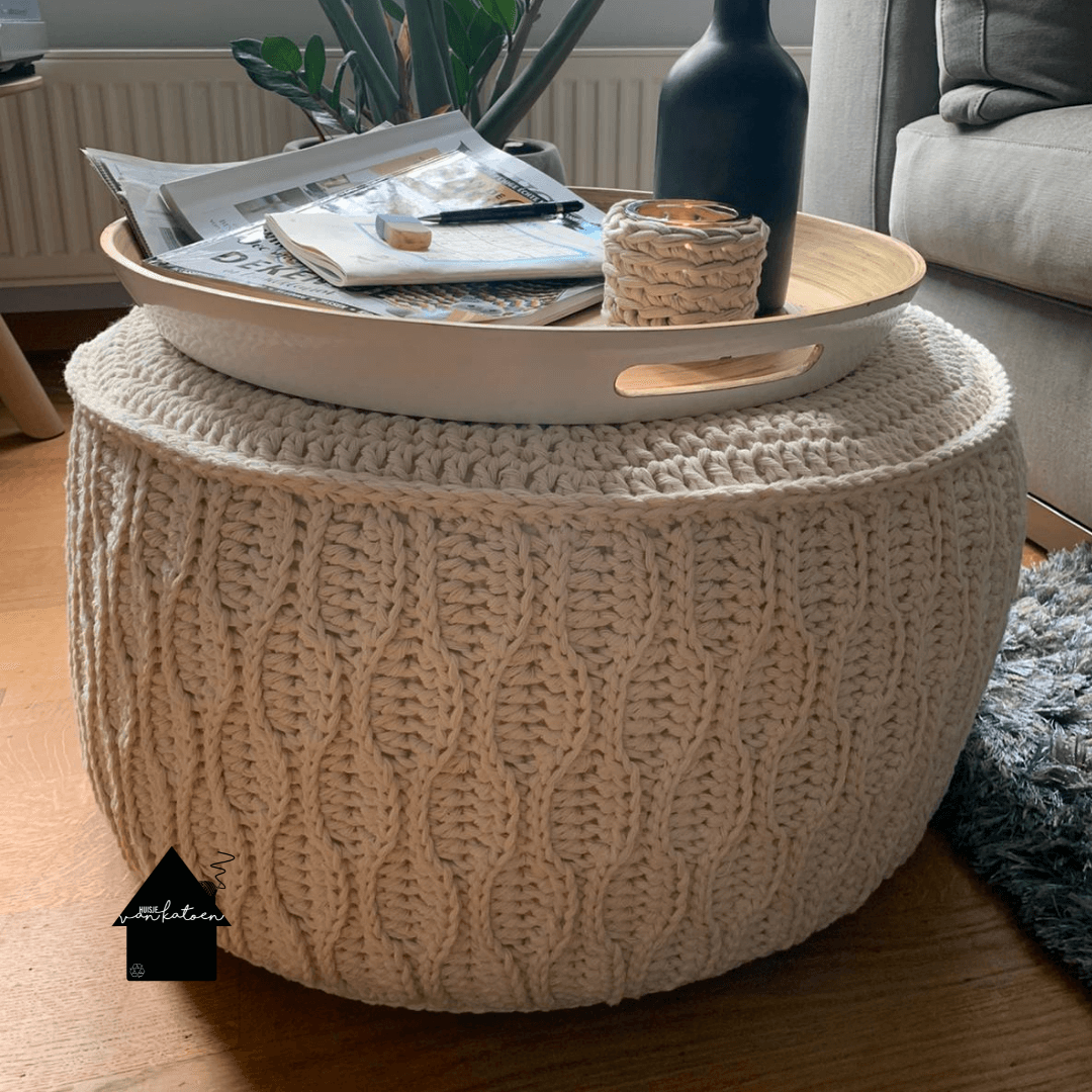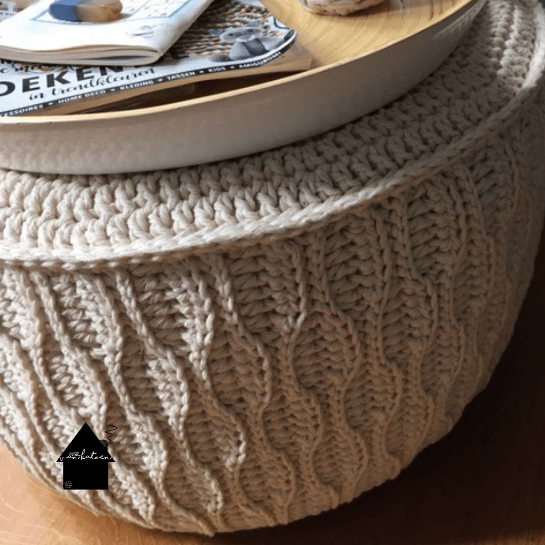 Wij hebben voor de poef een binnenpoef gebruikt welke wij een hele tijd zelf hebben verkocht. Echter kregen wij van de leverancier bij elke levering een andere kwaliteit. Hierdoor hebben we besloten om te stoppen met de verkoop. Als je op google zoekt op binnenpoef ga je zeker een aantal aanbieders tegenkomen. Wij hebben de maat gebruikt 30 cm hoog en 50 cm doosnee.