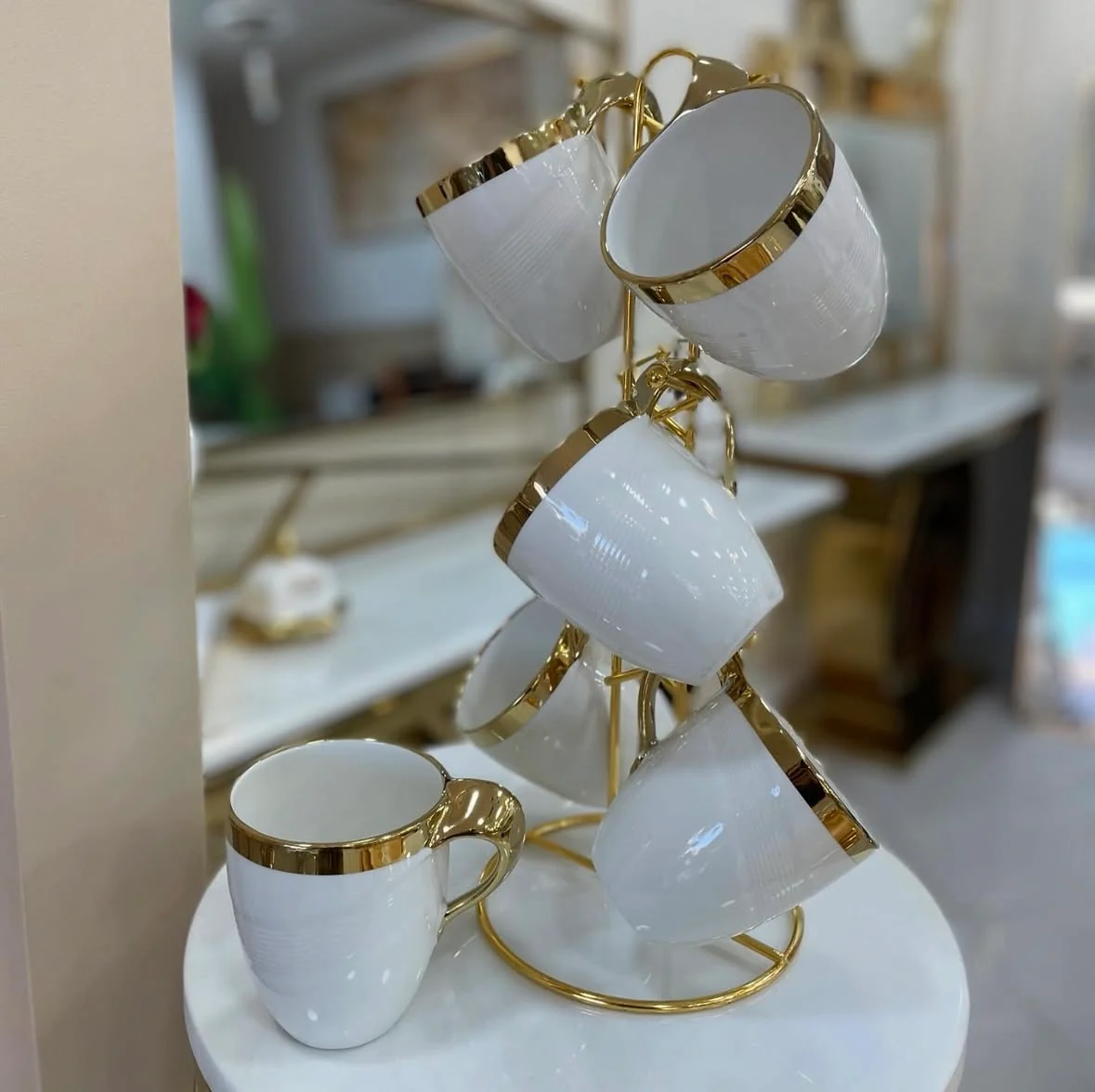 Deze 7-delige koffiemokken set combineert luxe uitstraling met praktisch gebruiksgemak. De set bestaat uit 6 porseleinen mokken in wit met elegante gouden details, en een bijpassende standaard waarmee je de mokken stijlvol kunt presenteren en ruimte bespaart in de keuken.