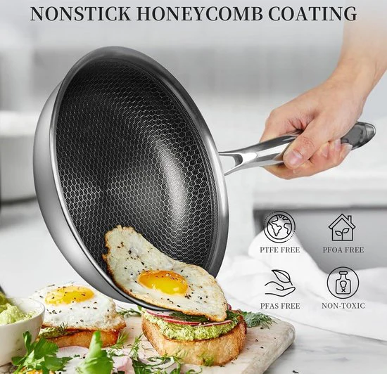 De unieke honeycomb anti-aanbaklaag voorkomt aanbranden, plakken en krassen. Zelfs bij gebruik van metalen spatels blijft het oppervlak als nieuw. Volledig vrij van PTFE, PFOA en PFAS, waardoor je gezonder kookt zonder giftige stoffen. Deze pan is ideaal voor alles van luchtige omeletten tot perfect gebakken vis en knapperig vlees, keer op keer met professionele kwaliteit.