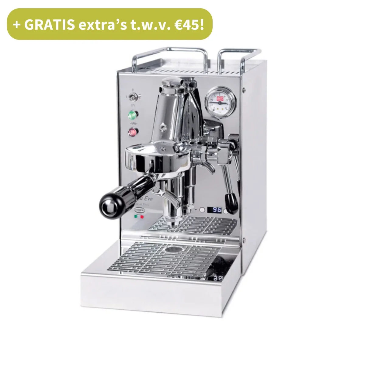 De Quick Mill 960 Carola is één van de meest compacte E61 espressomachines op de markt. Door het ontbreken van een stoompijpje kan de machine compacter vormgegeven worden en is dit een ideale espressomachine voor de echte (espresso)koffieliefhebber die geen stoom hoeft af te blazen. Een willekeurige melkschuimer kun je er natuurlijk altijd nog bijkopen. De Quick Mill Carola is tot het beste koffie resultaat in staat mede dankzij de PID die de boilertemperatuur perfect onder controle houdt. Met de instelbare OPV stel je zelf gemakkelijk de maximale druk af. De watertank is 1,8 liter groot en gemakkelijk vanaf boven in en uit te nemen.