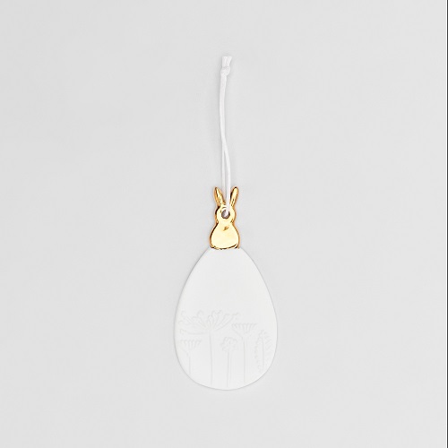 Prachtige mat wit porseleinen hanger van Räder. De hanger heeft de vorm van een ei met een bloemenprint in reliëf aan beide zijden. Aan de bovenkant zit een haasje dat aan beide kanten met de hand goudkleurig is geverfd. De hanger hangt aan een wit koordje. Superleuk aan je paastak!