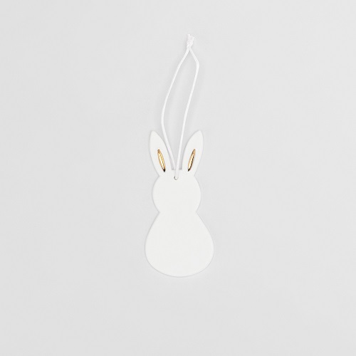 Prachtige mat wit porseleinen hanger van Räder. De hanger heeft de vorm van een haasje en de oortjes zijn aan beide zijden handbeschilderd glanzend goudkleurig. De hanger hangt aan een wit koordje. Superleuk aan je paastak!