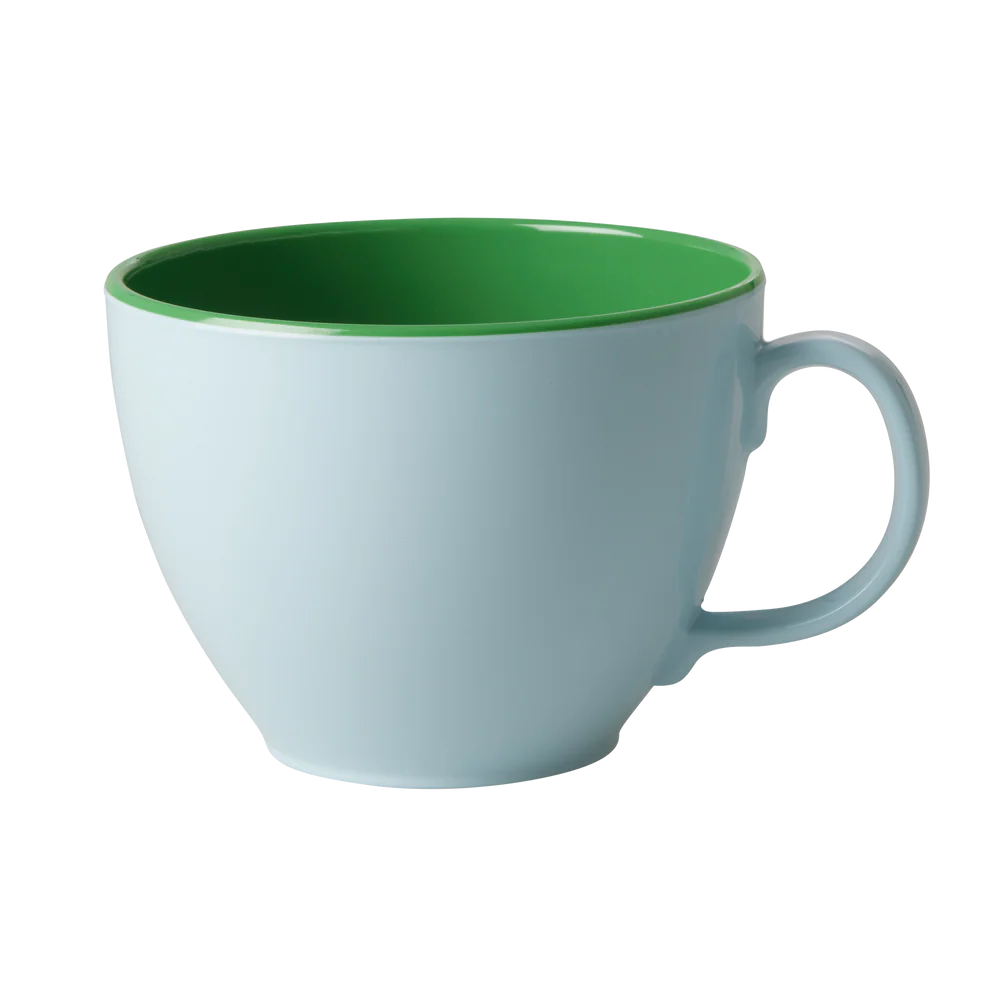Hoe leuk is de Melamine Jumbo mok van RICE in een mooie zachtblauwe kleur aan de buitenkant en een prachtige bosgroene kleur aan de binnenkant. Perfect voor een kopje thee of een warme chocolademelk bij de open haard met een knus dekentje. Houd er rekening mee dat deze producten niet geschikt zijn voor de magnetron.