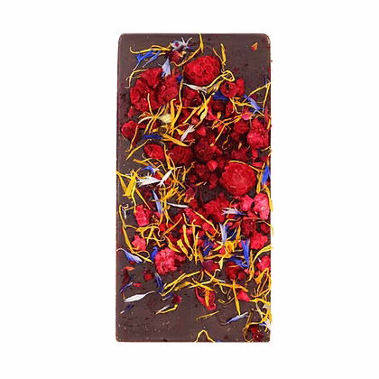 Ingrediënten:Pure chocolade (suiker, cacaoboter, cacaomassa, emulgator: sojalecithine , Bourbonvanille), gevriesdroogde frambozen, korenbloem, goudsbloem, monarda. Cacao minimaal 60%.