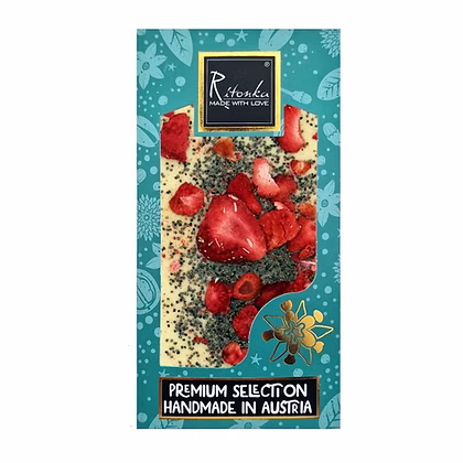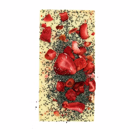 Ontdek de ongeëvenaarde smaak van onze handgemaakte witte chocolade reep met maanzaad en zoete aardbeien!