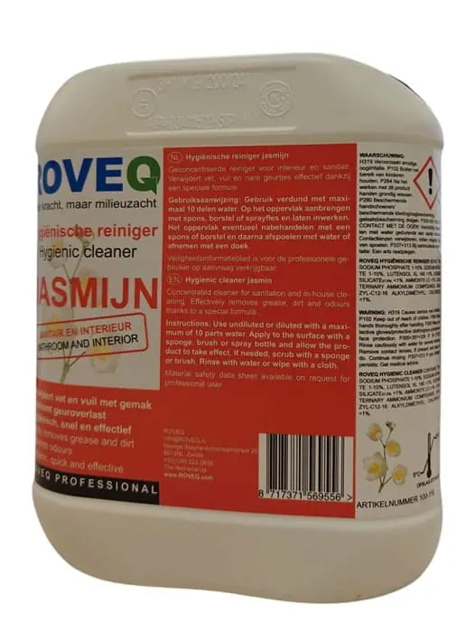 De ROVEQ Hygienische reiniger JASMIJN 5 liter is ideaal voor het gebruik tijdens alle dagelijkse schoonmaakklussen in huis. U kunt hem gebruiken voor het hygiënisch reinigen in de keuken, de badkamer, het toilet en voor vloeren. Hoewel het een krachtpatser is tegen vuil en vlekken zijn alle oppervlakten veilig voor deze Hyiënische reiniger.