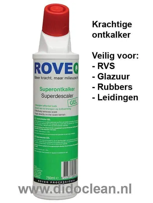ROVEQ Superontkalker gel 750 ml verwijdert veilig en effectief kalk en urinesteen. Door de gel blijft de Superontkalker makkelijker hechten op moeilijke plaatsen zoals onder de rand van de toiletpot of urinoir.