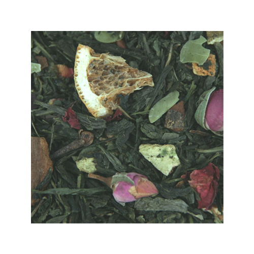 Groene thee met stukjes amandel, kaneel en sinaasappel. Een hele mooie winterse thee.