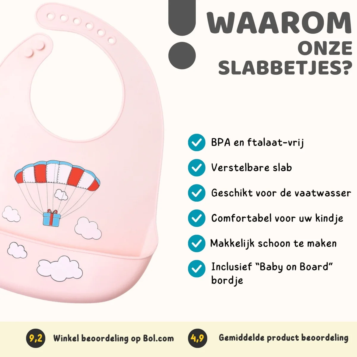 Onze comfortabele en makkelijk afneembare slabbetjes met opvangbakje zorgen voor een schonere omgeving tijdens het eten. Eten en drinken zal voortaan in het opvangbakje terecht komen, waardoor u de kleding van uw kind en de omgeving schoon houd. Doordat de slab van siliconen is gemaakt, is deze makkelijk schoon te maken en geschikt voor in de vaatwasser.
