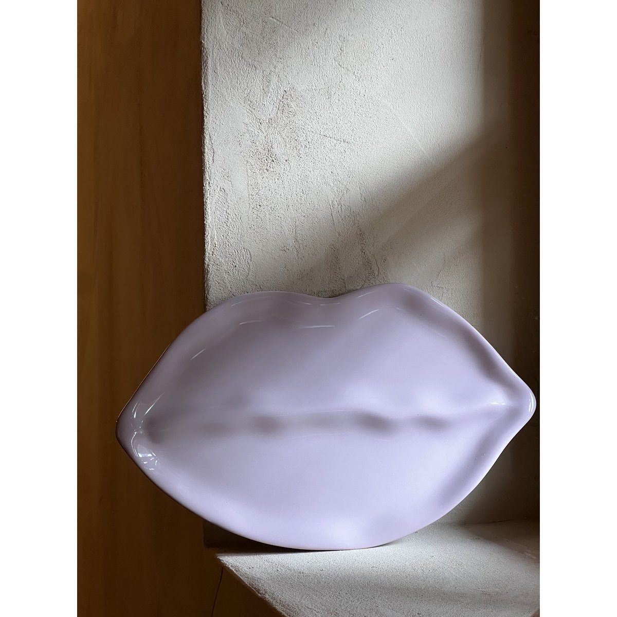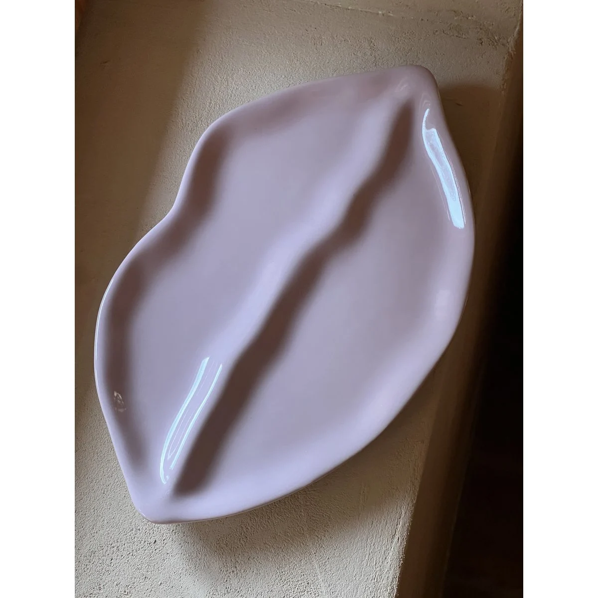 Een keramieken bord in de vorm van lippen kun je omschrijven als een speels serviesje. Het bord is gemaakt van hoogwaardig keramisch materiaal, waardoor een glad en glanzend oppervlak ontstaat dat op een paar lippen lijkt. Het biedt een unieke en opvallende toevoeging aan elke tafelsetting of decor. In levendige kleur, vervaagd lila. Ook verkrijgbaar in groen.