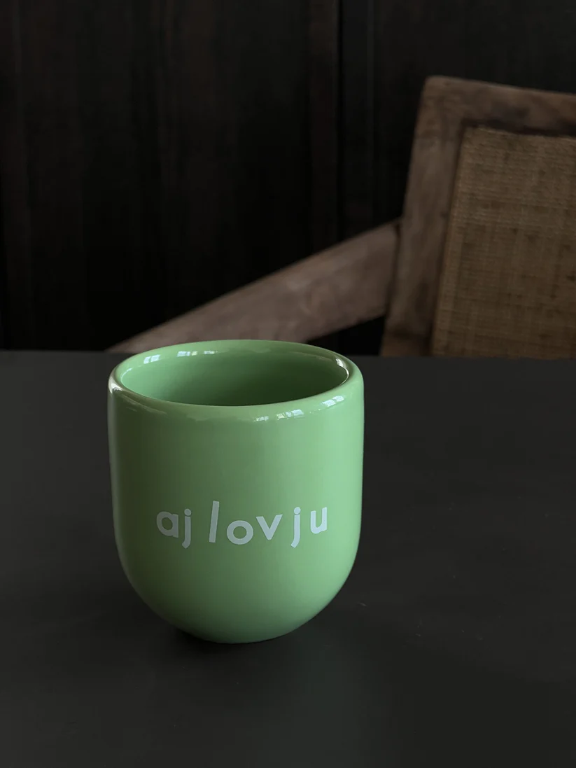 Keramiek glanzende mok, met tekst AJLOVJU.