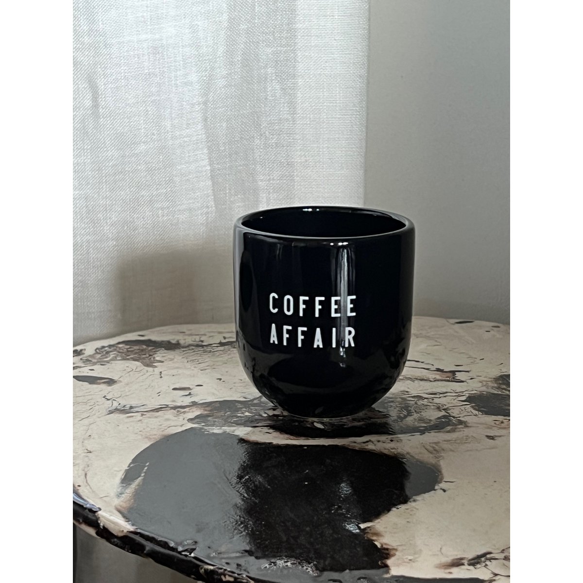 Deze koffiemok is ontworpen om je ochtendritueel naar een hoger niveau te tillen. Het moderne silhouet ligt comfortabel in de hand en vorm, zodat u gemakkelijk kunt nippen. Op het glanzende oppervlak van de mok is een sticker aangebracht met de uitdrukking “Coffee Affair” in stijlvolle typografie.
